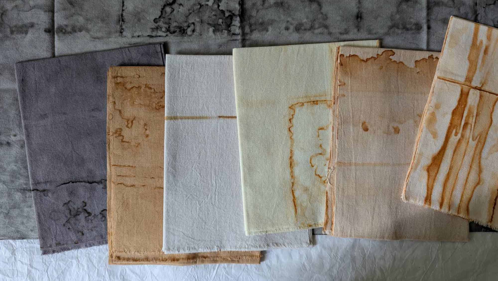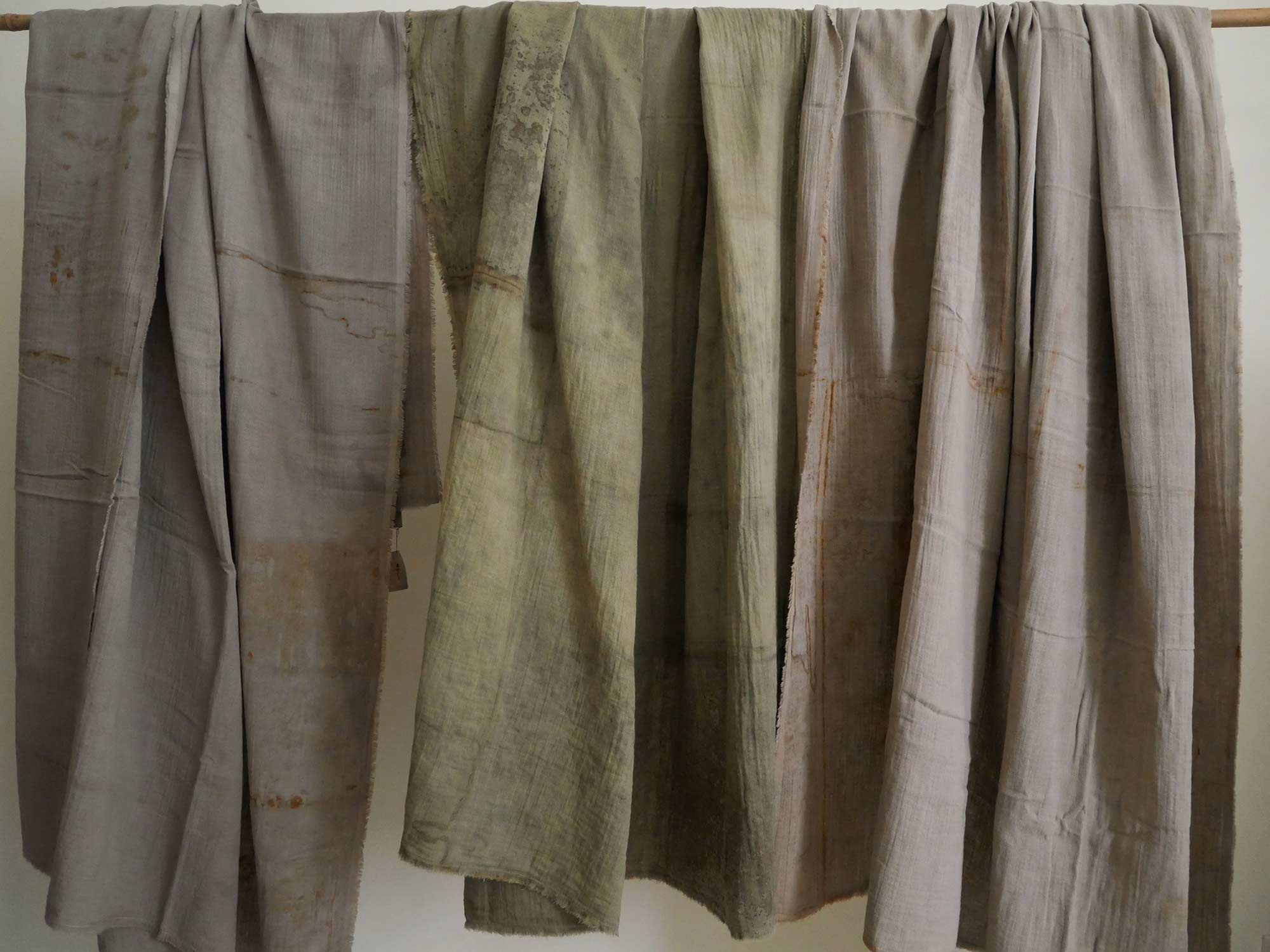 藉由鐵金屬氧化沁入布品,並與植物色彩覆染交疊出層次,呈現時間滲入布面的痕跡與流動,