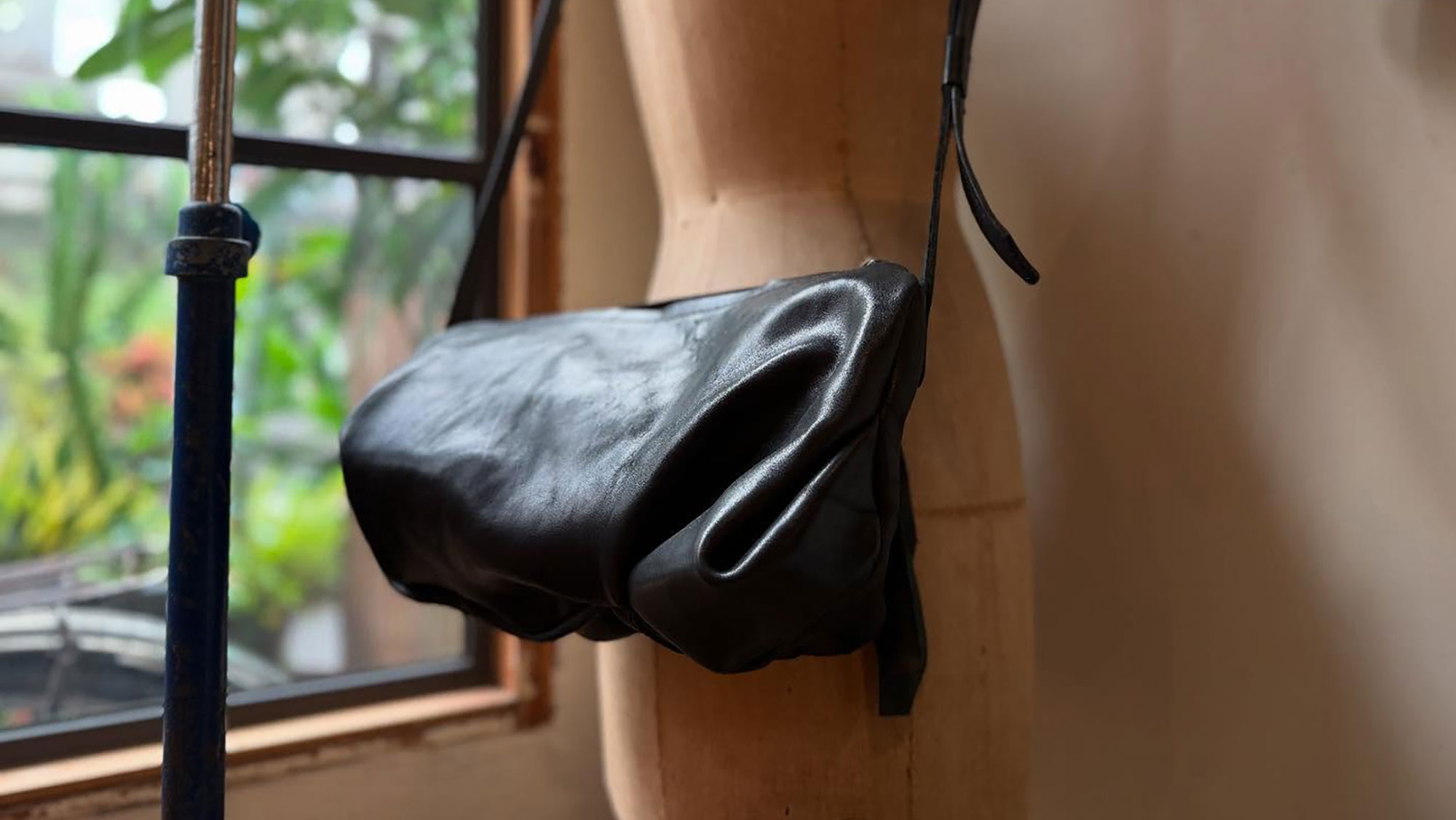 利用每一張皮革的不規則而捏製出每一件不同的曲線與縐褶,件件獨一無二。